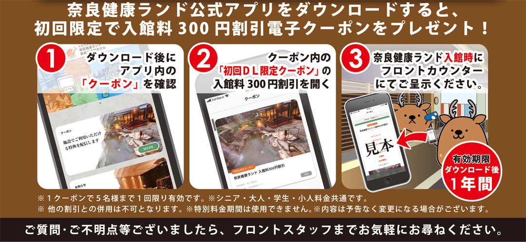 - 奈良健康ランド公式アプリをご利用のお客様に限ります。